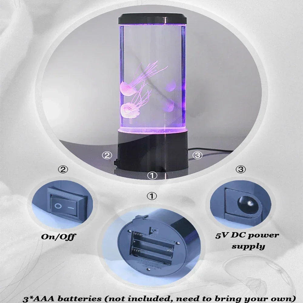 Alimentação USB Fácil: Com a Luminária de Água-viva LED, você nunca precisará se preocupar com a troca de baterias. Sua alimentação via USB permite uso prolongado e carregamento conveniente, tornando-a o complemento perfeito para qualquer ambiente.